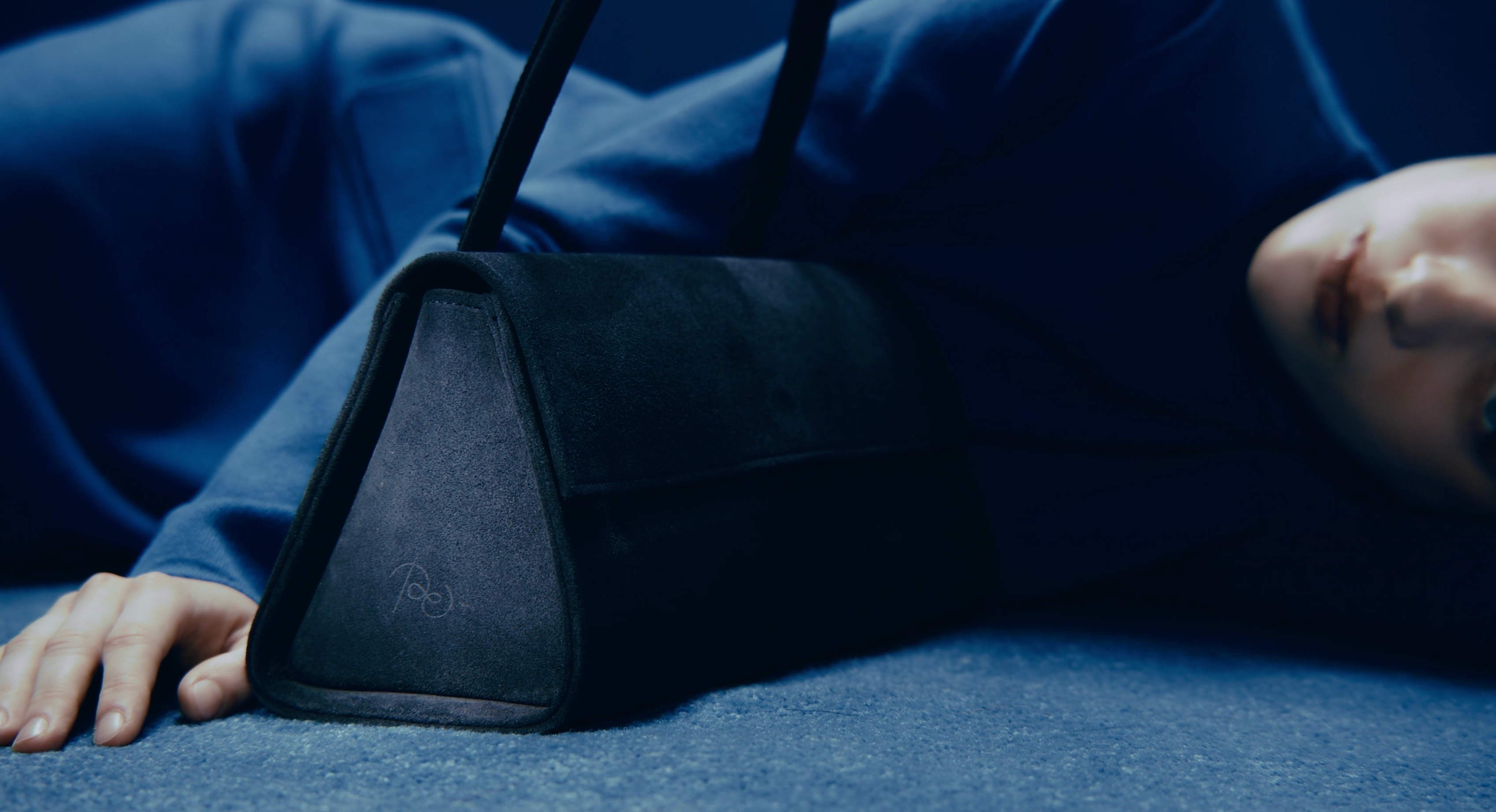 A mysterious shade of blue, inspired by the work of Yves Klein, became the main theme. Iconic POELLE models—the Carolyn and Object №03 shoppers, the Elza clutch, and the Bell handbag—were crafted from soft, deep blue suede.