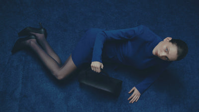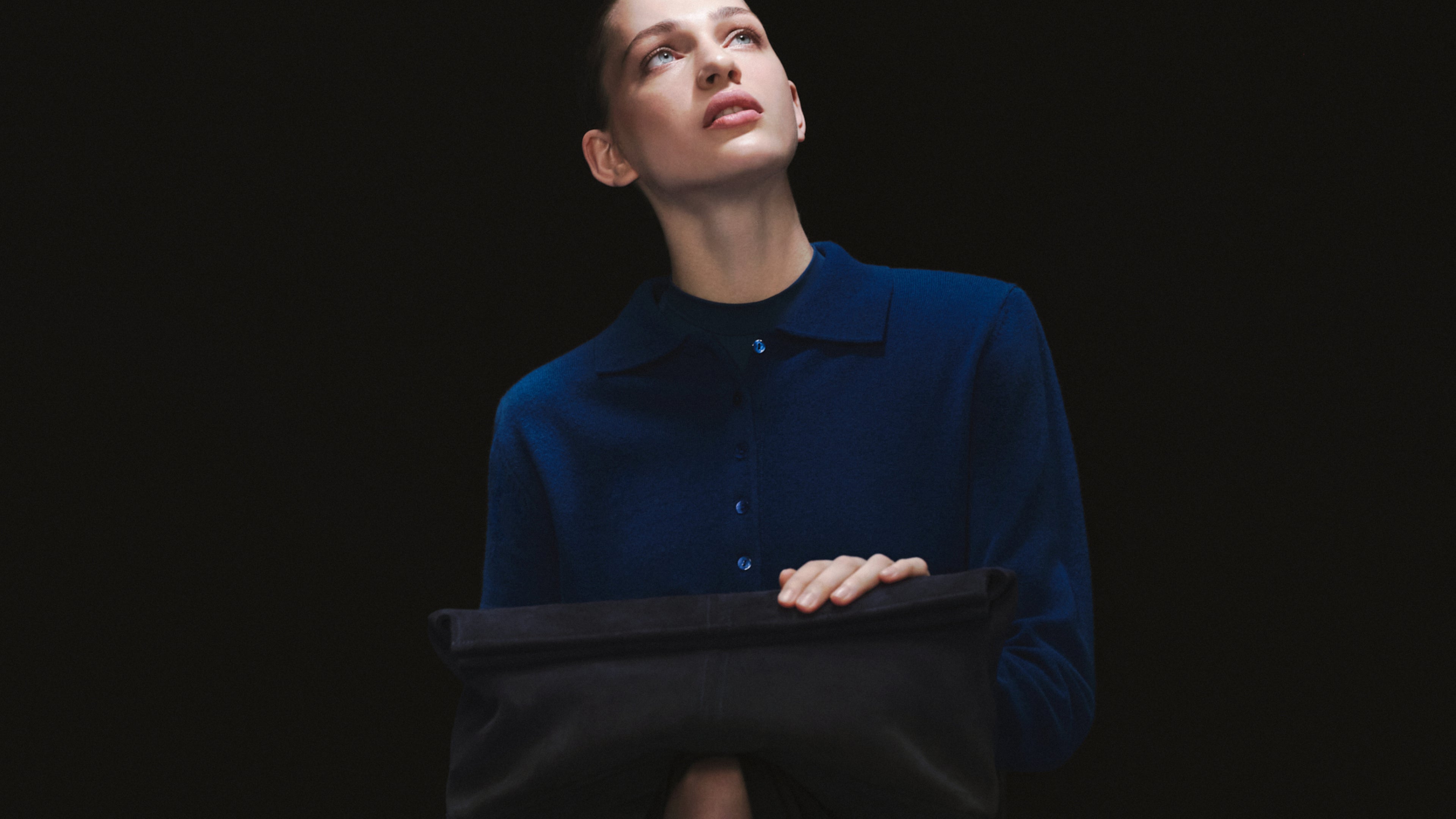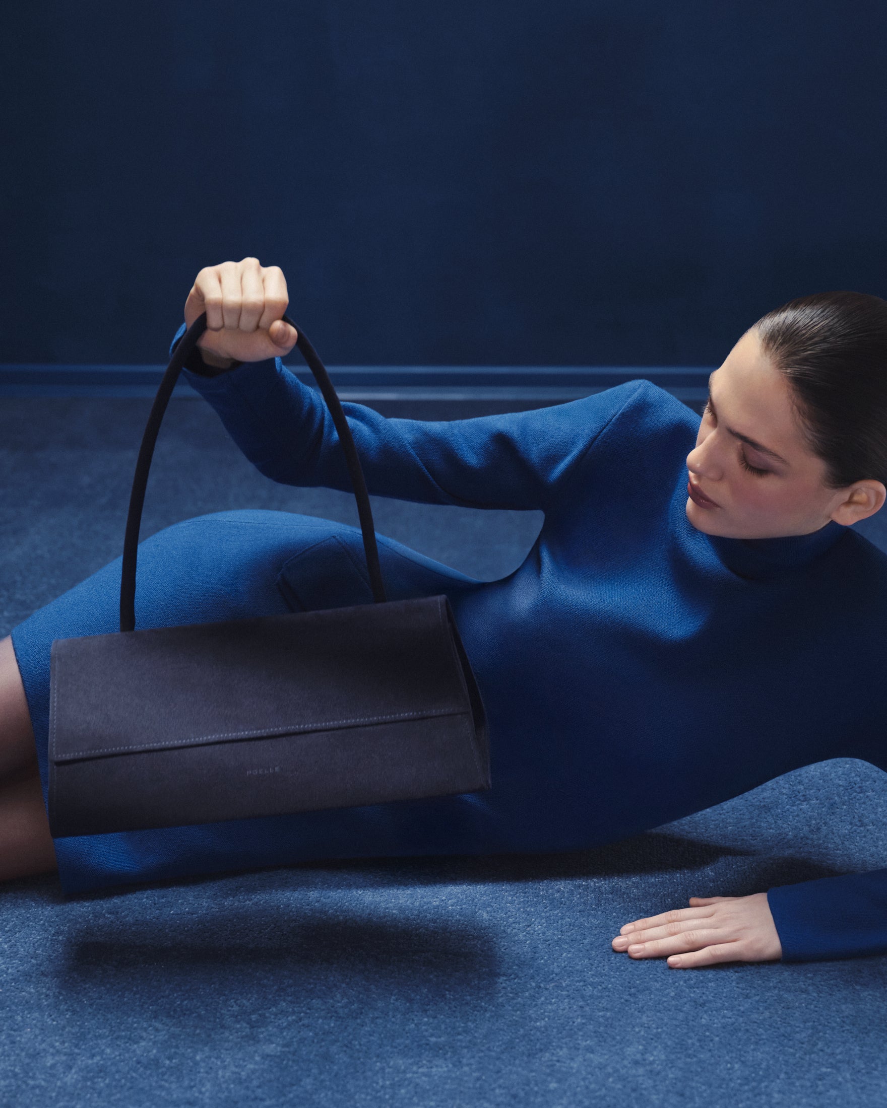 A mysterious shade of blue, inspired by the work of Yves Klein, became the main theme. Iconic POELLE models—the Carolyn and Object №03 shoppers, the Elza clutch, and the Bell handbag—were crafted from soft, deep blue suede.